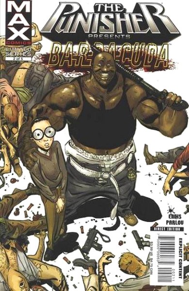 5 Part Mini Series starring Barracuda who first appeared in Punisher (MAX) #31. What? You didn’t actually think that a load of buckshot to the chest in shark-infested waters was gonna put him down for good, did you? The Punisher’s wildest foe is back -- give or take a few body parts -- this time he’s embarking on a solo mission: playing bodyguard to the son of a dangerous mob boss. Should be a breeze for a guy who went toe-to-toe with Frank Castle and lived to tell about it, right? Guess again. Junior is a hemophiliac -- and every crime syndicate in the country can’t wait to take a shot at him as payback to his dad. To survive, Barracuda will have to navigate hitmen, corrupt cops, black ops, a Central American strongman, and rescue a damsel in distress. No kidding.