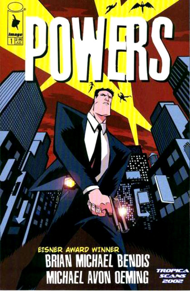 Powers is an on-going series started in 2000. It is written by Brian Michael Bendis and illustrated by Michael Avon Oeming. To date Powers has been collected into thirteen trade paperback volumes and four deluxe hardcover editions. Heroes glide through the sky on lightning bolts and fire. Flamboyant villains attempt daring daylight robberies. God-like alien creatures clash in epic battle over the nighttime sky. And on the dirty city streets below, Homicide Detective Christian Walker does his job. Detective Christian Walker is a special homicide officer in charge of cases that involve...Powers. What is a cop's job like in a world where Powers are par for the course? And what kind of cop is given the assignment? Find out in the gritty, new crime comic book series Powers from super hot comic writer and EISNER award winner Brian Michael Bendis (Sam And Twitch, Daredevil, Jinx, Batman) and art deco comic artist Mike Avon Oeming (Young Justice, Superman). This on going, hard-boiled crime comic with a mainstream twist is brought to you in startling full color by Pat Garrahy (JLA).