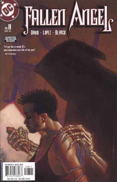 Fallen Angel is an American fictional comic book heroine created and owned by writer Peter David and artist David López, who appears in her self-titled monthly series. It was published by DC Comics from July 2003 until it was canceled with issue #20 in May 2005 because of low sales. It resumed publication through IDW Publishing in December 2005, and ran for 33 issues. It has since been followed by two mini-series, Fallen Angel: Reborn and Fallen Angel: Return of the Son. While not completely without humor, it is a very dark book with morally ambiguous characters. It was also one of the few "mature readers" books that DC published outside of its Vertigo imprint and was created to serve as a "bridge" between the general-audience DC titles and its Vertigo titles. The first series was illustrated in the typical pen-and-ink method of the comic book industry by penciller David López and inker Fernando Blanco. The first five-issue arc of the second series was painted by J. K. Woodward, though both Woodward and guest artists have utilized the traditional pen-and-ink method since then.