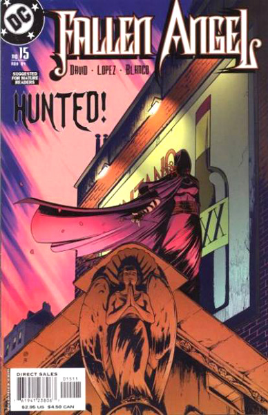 Fallen Angel is an American fictional comic book heroine created and owned by writer Peter David and artist David López, who appears in her self-titled monthly series. It was published by DC Comics from July 2003 until it was canceled with issue #20 in May 2005 because of low sales. It resumed publication through IDW Publishing in December 2005, and ran for 33 issues. It has since been followed by two mini-series, Fallen Angel: Reborn and Fallen Angel: Return of the Son. While not completely without humor, it is a very dark book with morally ambiguous characters. It was also one of the few "mature readers" books that DC published outside of its Vertigo imprint and was created to serve as a "bridge" between the general-audience DC titles and its Vertigo titles. The first series was illustrated in the typical pen-and-ink method of the comic book industry by penciller David López and inker Fernando Blanco. The first five-issue arc of the second series was painted by J. K. Woodward, though both Woodward and guest artists have utilized the traditional pen-and-ink method since then.