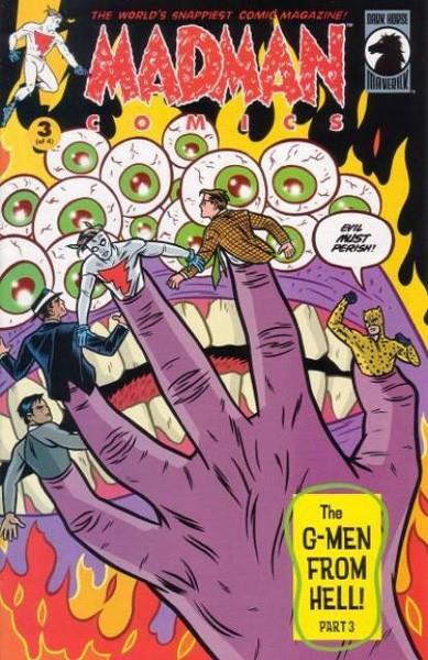 This is it! The all-new, all-exciting, bimonthly continuing series makes its triumphant return to the racks! Thrilling stories, brilliant art -- this is the one, folks! The comic-book event of the decade! In fact, this is the comic-book series you'll be telling your grandkids about. This first issue begins with a six-page introduction that finds Frank (a.k.a. Madman) having his brain waves recorded, explaining much of what's gone on in the previous series. Then, the main story, "Crash Course for the Ravers," involves creatures from outer space who crash into the outskirts of Snap City as local street beatniks are altered by an unknown element found in the city's sewers. Madman's world contains robots, aliens, mad scientists, and monsters. This comic boasts the best of action-adventure, science fiction, mystery, and romance. Thirty-two pages of cover-to-cover comics, and a splendid color back cover by none other than Frank Miller (Sin City)!