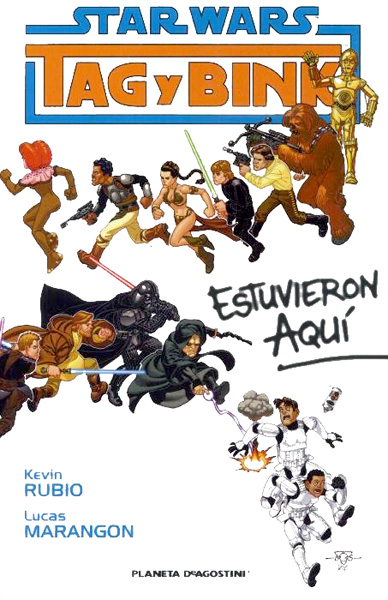 Llibre d'historietes enquadernat en rústica de 104 pàgines interiors en color més cobertes que conté la traducció dels comic books originals Star Wars: Tag & Bink Are Dead números 1 al 2 i Star Wars: Tag & Bink II publicat als EUA per Dark Horse entre 2001 i 2006. Volum únic.