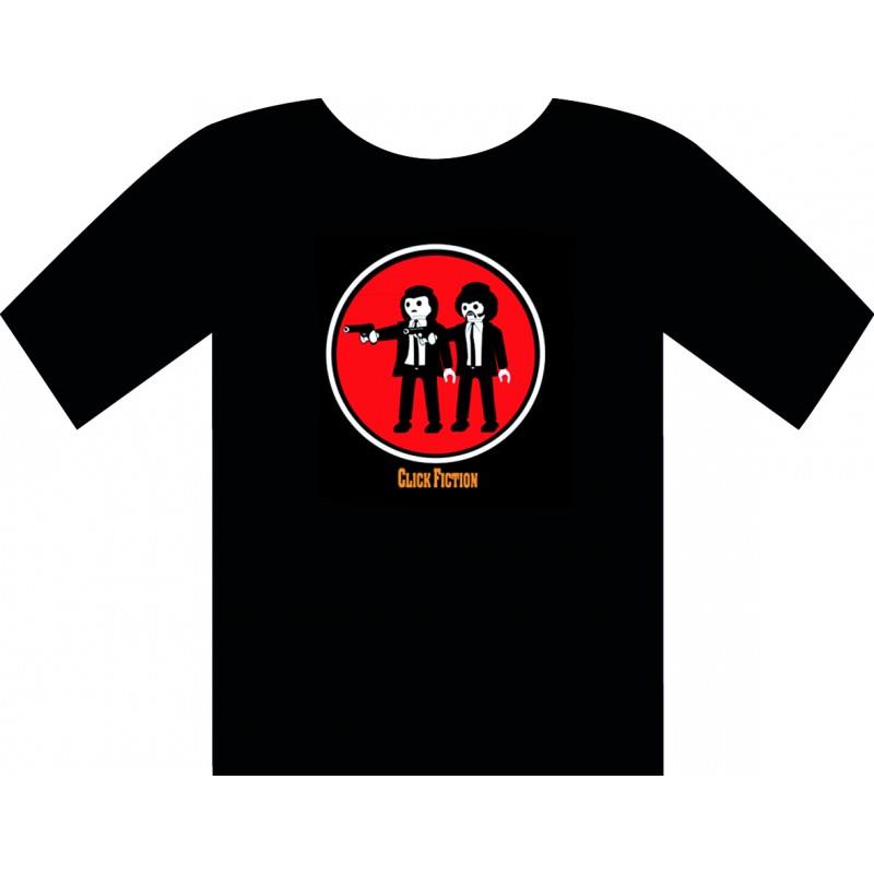Click Fiction es una de las camisetas divertidas diseñadas Pachi Balaguer y producida por la Gamba Taronja, en la que se fusiona la popular película Pulp Fiction (dirigida por Quentin Tarantino) con la estética de los clicks de playmobil.