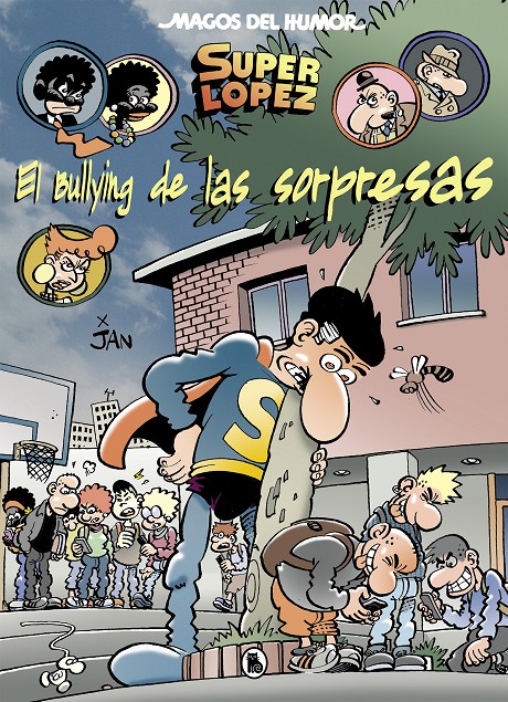 íSuperlópez contra el bullying als centres educatius! L'assetjament a les aules, conegut com a bullying és un problema molt seriós, que preocupa tant a educadors com a pares d'alumnes. A El bullying de les sorpreses, Superlópez intentarà mediar en un cas de bullying en un institut, per intentar solucionar-ho. Paral·lelament a aquests fets, Superlópez es veurà implicat en l'assalt a un banc, en el qual també tindrà protagonisme A contraposa, el cap d'una banda de delinqüents, habitual en les aventures de Superlópez.