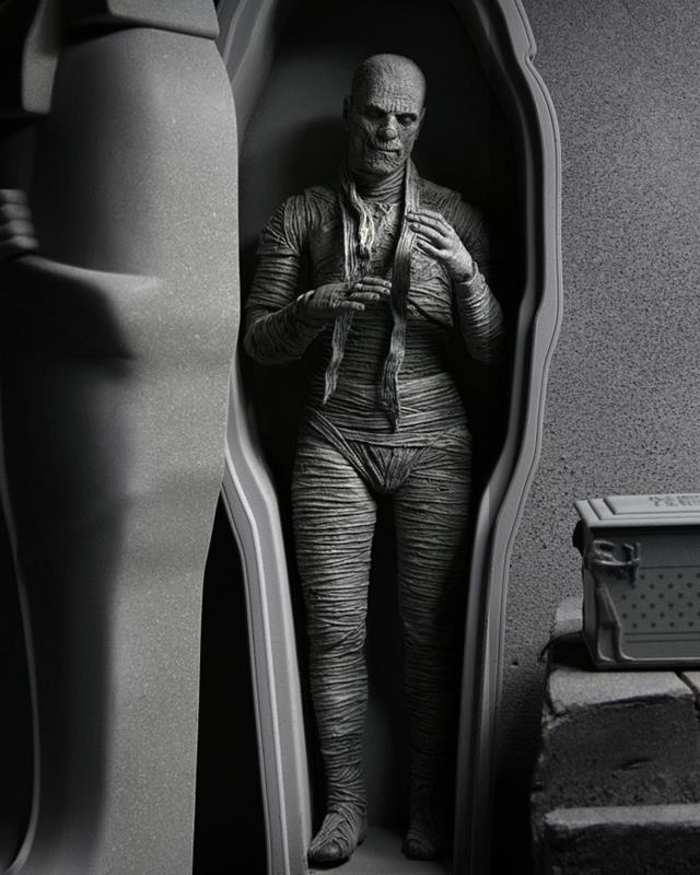 Neca presenta, en commemoració del 90è aniversari, aquesta figura articulada de la Mòmia, inspirada en el personatge del clàssic de Boris Karloff. Es tracta d'una figura feta en PVC, amb una mida d'uns 18 cm d'alçada i inclou 3 caps intercanviables, mans, benes i papir.