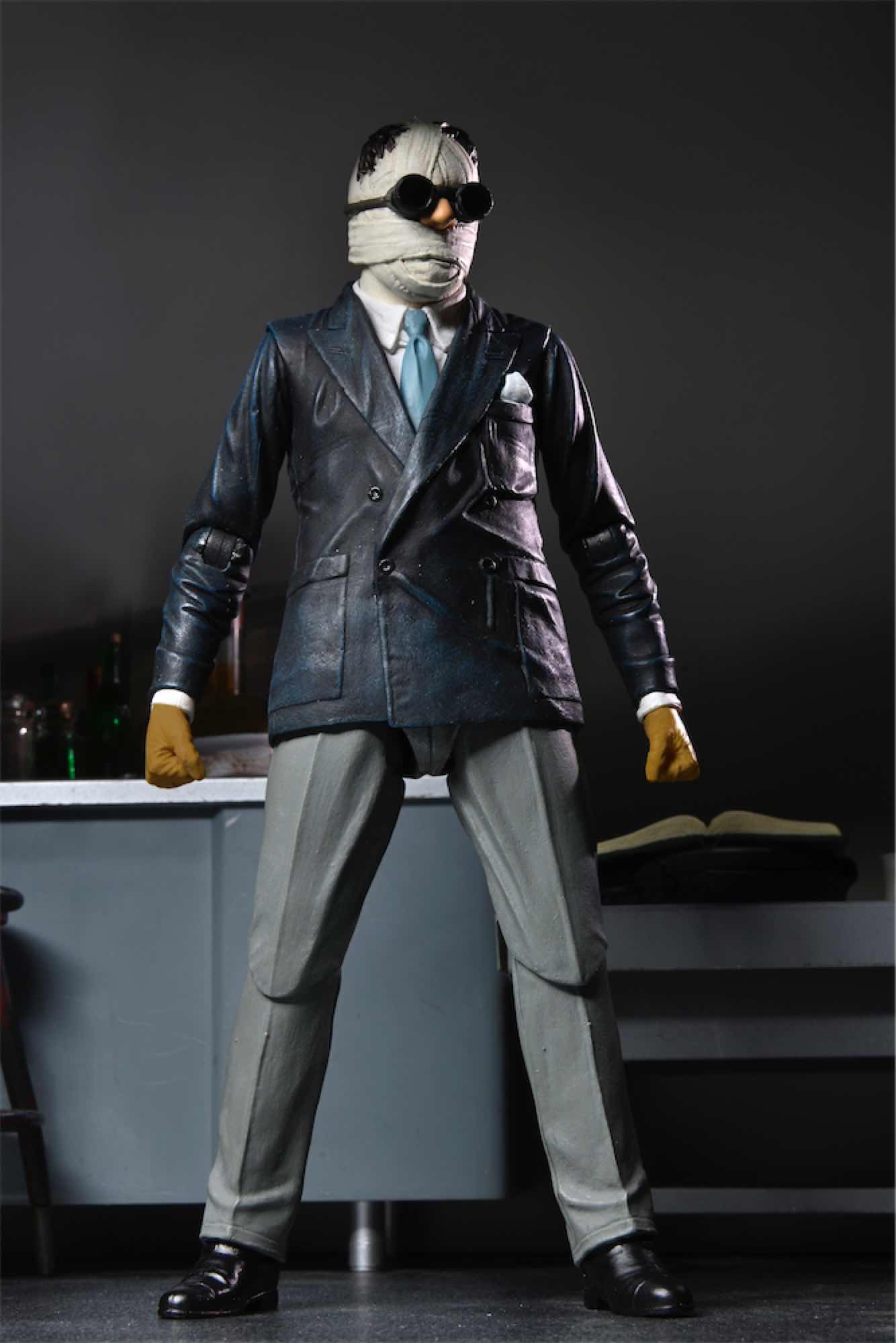 NECA es complau a presentar l'home invisible en forma de figura d'acció definitiva. Protagonitzada per Claude Rains, L'home invisible del 1933 es va basar en la clàssica novel·la d'H.G. Wells i va rebre elogis de la crítica, arribant a ser inclosa al Registre Nacional de Pel·lícules dels Estats Units per la seva importància històrica. Els caps intercanviables capturen la versió aparentment sòlida embolicada, així com les versions parcialment descobertes amb mirades a l'insà buit interior. També s'hi inclouen les mans amb embolcall i guants intercanviables, les ulleres, el nas, el quadern, la perruca i la tassa amb palla. La figura té una mida de 18 cm i es presenta en una caixa amb finestra que s'obre a la part davantera.