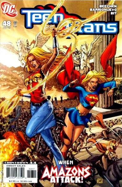 This volume of Teen Titans spun out of the shattering events of Graduation Day, an event which featured the death of both Donna Troy and Lilith and saw the end of both Young Justice and the Titans. Scribed by Geoff Johns, this incarnation of the Teen Titans began as a training initiative on the behalves of Cyborg, Starfire, and Beast Boy and featured the main cast of Young Justice. The team does battle with a returned Jericho, Deathstroke, the new Ravager, and the new Brother Blood, all while picking up new members, such as Raven and Speedy (Mia Dearden). A popular story arc during the first portion of this series was the Titans of Tomorrow arc. This arc featured the current team being flung into the future to find themselves totalitarian rulers of a dystopia society. The team remained very solid during the first 33 issues leading up to Infinite Crisis and One Year Later.