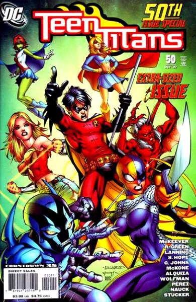 This volume of Teen Titans spun out of the shattering events of Graduation Day, an event which featured the death of both Donna Troy and Lilith and saw the end of both Young Justice and the Titans. Scribed by Geoff Johns, this incarnation of the Teen Titans began as a training initiative on the behalves of Cyborg, Starfire, and Beast Boy and featured the main cast of Young Justice. The team does battle with a returned Jericho, Deathstroke, the new Ravager, and the new Brother Blood, all while picking up new members, such as Raven and Speedy (Mia Dearden). A popular story arc during the first portion of this series was the Titans of Tomorrow arc. This arc featured the current team being flung into the future to find themselves totalitarian rulers of a dystopia society. The team remained very solid during the first 33 issues leading up to Infinite Crisis and One Year Later.