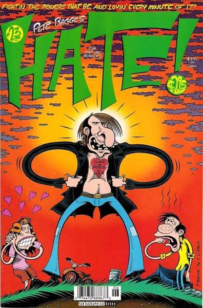 Hate was written and illustrated by Peter Bagge it first published in 1990 and ran for 30 issues released on a quarterly schedule. Hate is Buddy Bradley's from "The Bradley's" of Peter Bagge's Neat Stuff story. In the first 15 issues he lives in Seattle with his room mates Stinky and George, while finding love with Valerie then Lisa. Issues 16 onwards see Buddy and Lisa move back to the suburbs of New Jersey and reintroduces Buddy's family.