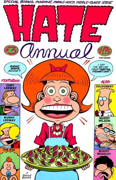 Hate was written and illustrated by Peter Bagge it first published in 1990 and ran for 30 issues released on a quarterly schedule. Hate is Buddy Bradley's from "The Bradley's" of Peter Bagge's Neat Stuff story. In the first 15 issues he lives in Seattle with his room mates Stinky and George, while finding love with Valerie then Lisa. Issues 16 onwards see Buddy and Lisa move back to the suburbs of New Jersey and reintroduces Buddy's family.