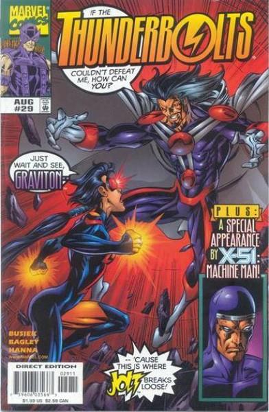 "No one ever said being good would be easy". The much acclaimed saga of Marvel villains becoming heroes. After 81 issues, the series took a brief hiatus. A few months later, the Thunderbolts returned in the mini-series Avengers/Thunderbolts before returning fully in the ongoing New Thunderbolts series with a new number one. The original numbering however is also visible, making that issue 82 - 99 of the collective Thunderbolts series. The series returned to its original numbering with issue 100 in Thunderbolts (2006). The series had two annuals,Thunderbolts '97 and Thunderbolts 2000 and an annual-like special in 2001 named Thunderbolts: Life Sentences.