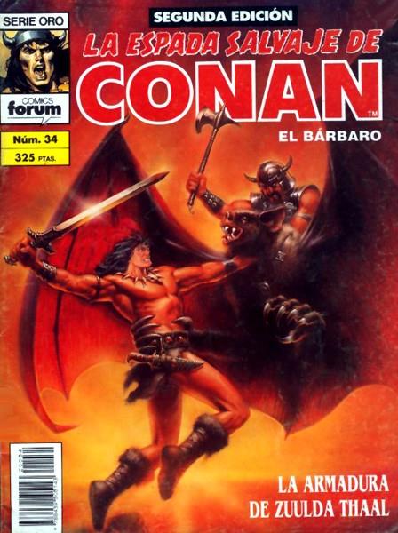 Revista de historietas grapada de 64 páginas interiores en blanco y negro más cubiertas en color que contiene la traducción de los comics originales The Savage Sword of Conan Volume 1 números 23 y 87 publicados en USA por Marvel Comics entre 1974 y 1995. Continuación de la serie de 11 volúmenes de Super Conan esta colección es una reedición de 1995 de los primeros 144 números de la colección de 171 números de la primera edición.
