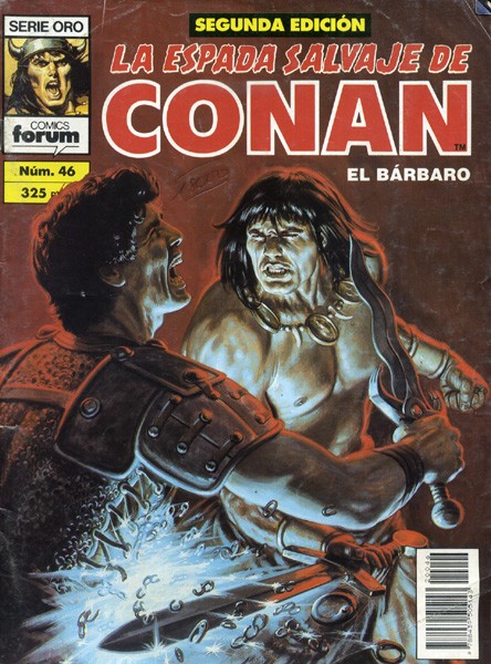 Revista de historietas grapada de 64 páginas interiores en blanco y negro más cubiertas en color que contiene la traducción de los comics originales The Savage Sword of Conan Volume 1 números 43 y 103 publicados en USA por Marvel Comics entre 1974 y 1995. Continuación de la serie de 11 volúmenes de Super Conan esta colección es una reedición de 1995 de los primeros 144 números de la colección de 171 números de la primera edición.