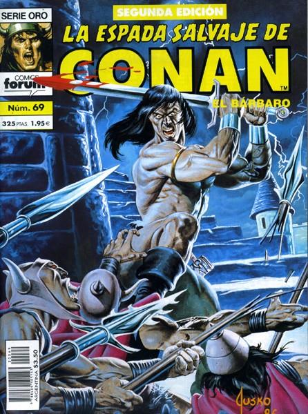 Revista de historietas grapada de 64 páginas interiores en blanco y negro más cubiertas en color que contiene la traducción de los comics originales The Savage Sword of Conan Volume 1 números 58 y 131 publicados en USA por Marvel Comics entre 1974 y 1995. Continuación de la serie de 11 volúmenes de Super Conan esta colección es una reedición de 1995 de los primeros 144 números de la colección de 171 números de la primera edición.