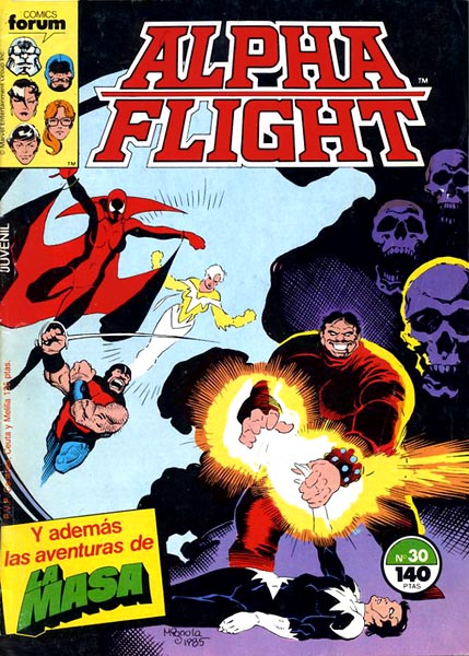 Alpha Flight es una serie creada por John Byrne que la llevó adelante en solitario durante los primeros 27 números americanos, en España fue publicada en comic books de 32 páginas hasta el número 34 en las que pasó a tener 64 páginas y a compartir cabecera con La Masa y pasando la periodicidad a bimestral.