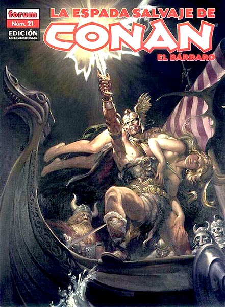Revista de historietas encuadernada en rústica de 64 páginas interiores en blanco y negro más cubiertas en color que contiene la traducción del comic original The Savage Sword of Conan Volume 1 número 45 publicado en USA por Marvel Comics entre 1974 y 1995. Continuación de la serie de 11 volúmenes de Super Conan esta colección es una reedición de 2005 de los primeros 85 números de la colección de 171 números de la primera edición.