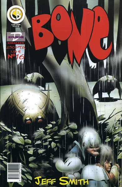 Cuaderno de historietas grapado de 24 páginas interiores en blanco y negro más cubiertas en color que contiene la traducción del comic book original Bone número 16 publicado en USA por Cartoon Books. Serie de 46 volúmenes.