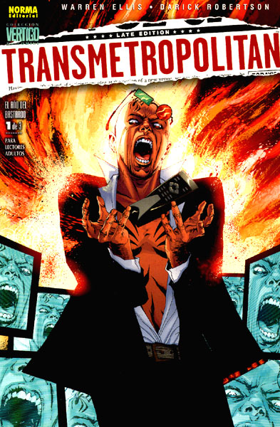 Libro de historietas encuadernado en rústica 48 páginas interiores en color más cubiertas que contiene la traducción de los comic books originales Transmetropolitan números 13 al 14 publicados en USA por DC Comics dentro de su línea Vértigo. Serie de 3 volúmenes.