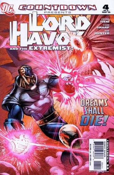 Written by Frank Tieri Art and cover by Liam Sharpe Don't miss this special 6-part COUNTDOWN miniseries featuring the most powerful beings on Earth-8 - Lord Havok and his Extremists - written by Frank Tieri (GOTHAM UNDERGROUND) and illustrated by Liam Sharp (TESTAMENT)! Lord Havok! Dr. Diehard! Tracer! Gorgon! Dreamslayer! Carny! Meet these dangerous individuals and learn why they are so integral to COUNTDOWN and the fate of the Multiverse! Guest-starring Monarch, the Monitors, Donna Troy, Jason Todd and Kyle Rayner!