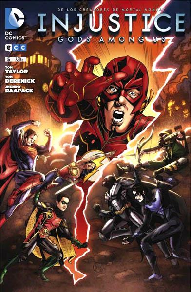Cuaderno de historietas grapado de 32 páginas interiores en color más cubiertas que contiene la traducción del comic book original Injustice: Gods among us número 5 publicado en USA por DC Comics.
