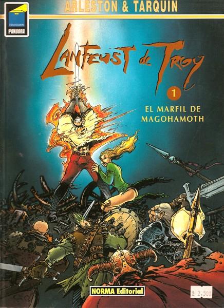 Libro de historietas encuadernado en rústica en formato álbum de 48 páginas interiores en color más cubiertas que contiene la traducción del original Lanfeust de Troy 1. L'ivoire du Magohamoth publicado en 1994 por Soleil para el mercado francobelga. Serie de 8 volúmenes editados en Francia, de los que Norma solo publicó el primero.