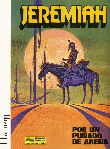 Libro de historietas encuadernado en cartoné en formato álbum de 48 páginas interiores en color más cubiertas que contiene la traducción del original Jeremiah 2 Du sable plein les dents publicado en 1979 por Fleurus para el mercado francobelga.