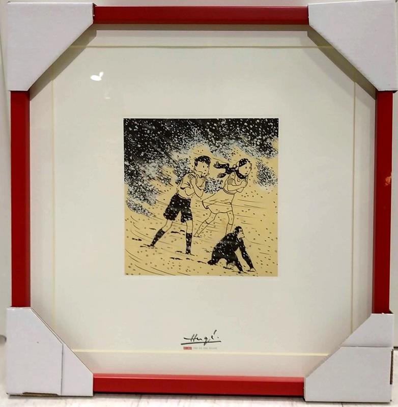 Litografía enmarcada que corresponde a una edición limitada de 1000 ejemplares de Moulnisart en conmemoración del centenario del nacimiento de Hergé en 2006 que contiene una escena de la serie Jo, Zette y Jocko. Volumen único de una serie de 10 litografías.