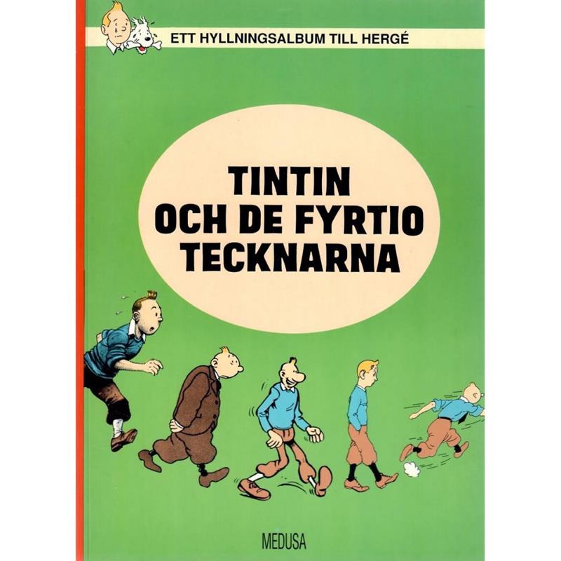"Tintin et les quarante personnages" est un album hommage à Tintin et à son créateur Hergé. Après la mort du créateur de "Tintin" Hergé en 1983, le magazine français pour adultes (A Suite) a invité plusieurs dessinateurs à exprimer leurs réactions à Tintin, Hergé et leur départ dans un numéro spécial paru au printemps 1983 Plus tard, la série a également été publiée dans un album relié. En 1989, Swedish Medusa a publié une version abrégée de cet album en suédois, mais avec plusieurs créateurs de séries suédoises représentés et contenant plusieurs articles de connaisseurs de séries.
