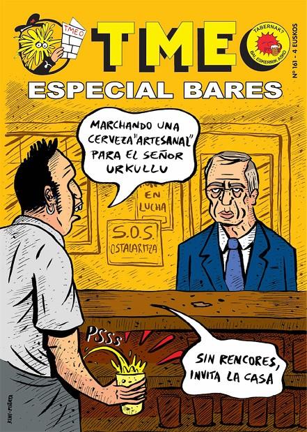 Después de un año largo sin vender el TMEO en pequeños comercios y bares ni cobrarles la publi porque bastante tenían con lo que tenían, ahora volvemos a ellos con unas ganas de la hostia. Y nos hemos currado un cartel Tabernak? Bai. Eskerrik asko que colocaremos por calles y ba-res para ver si conseguimos que todos los parroquianos vuelvan a hacer uso intensivo de nues-tras tascas y de paso se pillen ahí el TMEO. Porque el TMEO nació en un bar hace ya 34 años, somos los mayores fans de nuestras taber-nas. La vida sin bares, es menos vida. Este TMEO va por todos nuestros bares, por sus dueños, por todos los que se dejan la piel sirviéndonos una fresca cerveza o un vivificante vino. Gora tabernak! Gora TMEO!