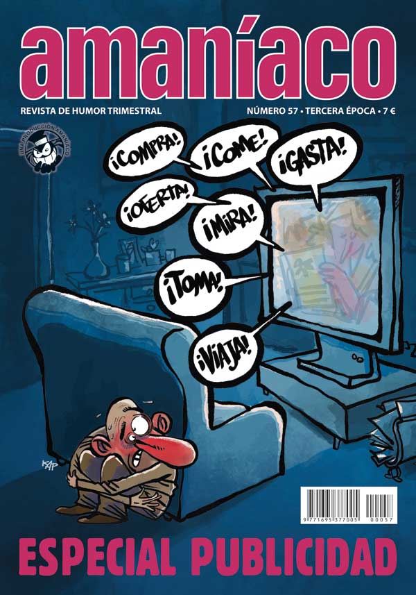 Comprad, comprad nuestros hermosos tebeos! Anuncios, anuncios y más anuncios estamos rodeados por la publicidad, nos persigue, nos acosa, la tenemos hasta en la sopa por esta razón, vamos a ser originales y os anunciamos que este número de Amaníaco es un especial publicidad. Pero tranquilos, que este número viene cargado con un montón de historietas y ningún anuncio, no tendrás cortes publicitarios entre página y página, ni te encontrarás con eso de los cinco minutos y volvemos. Humor del bueno, para reír y pasar un buen rato entretenido en cualquier lugar. Así de simple, sin letra pequeña, como en las hipotecas o en los seguros que nos venden. Y ya lo sabéis, como decían en un antiguo anuncio de una conocida marca de detergente: Busca, compara y, si encuentras algo mejor sigue leyendo el Amaníaco!