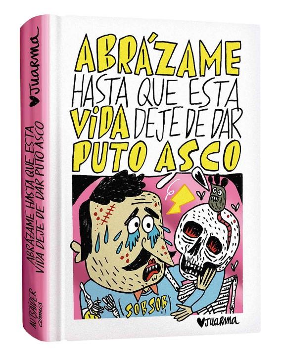 Odio desde el cariño. Dicho así puede parecer un concepto improbable, aunque algo parecido a eso es lo que exuda ABRÁZAME HASTA QUE ESTA VIDA DEJE DE DAR PUTO ASCO de Juarma. Se cisca en la idiocia generalizada, se mofa de la mentira sistémica y principalmente, de lo a gusto que la deglute el personal y de cómo ejercen de cómplices, chivatos y carceleros de esta patraña mal organizada. Hay cantidades escalables de mala hostia, de justificadísimo odio a la humanidad y deseos de exterminio, pero desde el cariño, a ver si me explico, medio apelando a un propósito de la enmienda en un tono de humor descacharrante con la suficiente ironía y acierto como para interpelar a cualquiera que medio le funcione la cabeza. Frases lapidarias en una sola viñeta que catalizan la realidad y la mala leche transformándola en deshueve y reflexión.