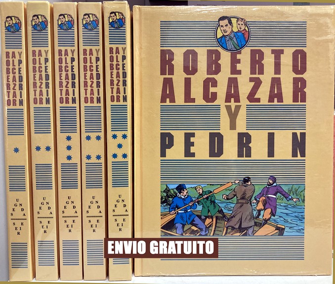 Pack con 6 libros de historietas encuadernados en cartoné de 200 páginas interiores en color más cubiertas que contiene una reedición de las historietas de Roberto Alcázar y Pedrín, 2ª serie de la reedición de la colección, que recopila los números 26 a 46 de Roberto Alcázar y Pedrín Extra y del 241 a 262 de Roberto Alcázar y Pedrín en 6 tomos a todo color. Serie de 6 volúmenes.
