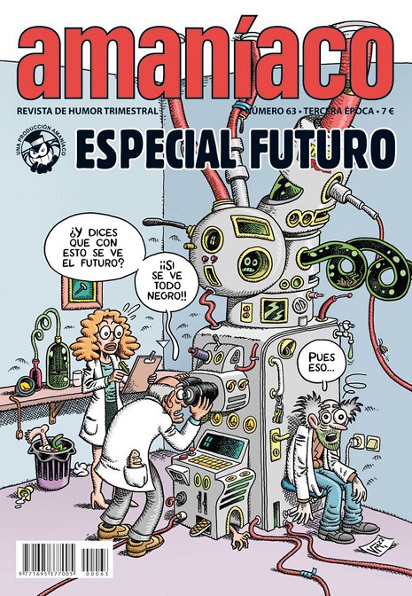 Amaníaco 63. Especial futuro El futuro es muy negro, que alguien encienda la luz ¿Qué será, será lo que vendrá? Lo ignoramos, pero lo que sí sabemos es que llega el nuevo número de Amaníaco, un especial futuro. Ignoramos qué nos traerán los tiempos venideros, no somos pitonisos, pero los autores de Amaníaco han plasmado en sus páginas su visión de como se imaginan el día de mañana. Y, aunque la cosa está bastante negra y cada vez hay más voces catastrofistas anunciando la caída de un meteorito o algún loco de dedo fácil sobre el botón rojo, siempre hay la esperanza de que las generaciones futuras puedan seguir disfrutando de las revistas de historietas como el Amaníaco, que en este número viene con más páginas. Tú, como lector, puedes ayudar a que el porvenir sea menos funesto y más divertido, compra y lee el Amaníaco especial futuro. Que vivan los tebeos.