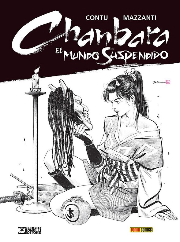 Libro de historietas encuadernado en rústica de 112 páginas interiores en blanco y negro más cubiertas en color que contiene la traducción del original Chanbara. Il mondo sospeso publicado en Italia por Bonelli.