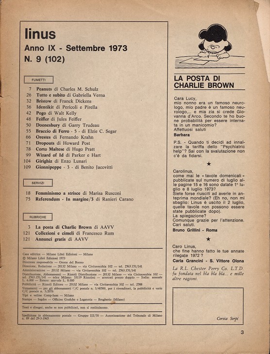 Desde sus inicios, la sección de cómic se acompañó de una extensa sección dedicada a asuntos de sociedad, política, mass media, literatura y cultura en general. El primer número, por ejemplo, contenía una entrevista realizada por Umberto Eco al novelista Elio Vittorini.