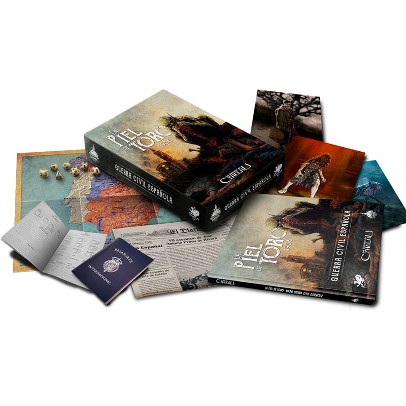 La Piel de Toro 1936, tres láminas de calidad y a color con imágenes destacadas, periódico de noticias de 1936, cinco pasaportes que servirán de salvoconducto a tus personajes, con apartados para que puedas rellenar tu hoja de personaje en ellos, un juego de dados exclusivo listo para pifiar, un mapa de España con las ciudades, posiciones y situación de la Guerra Civil en 1936, una caja a todo color para guardarlo todo.