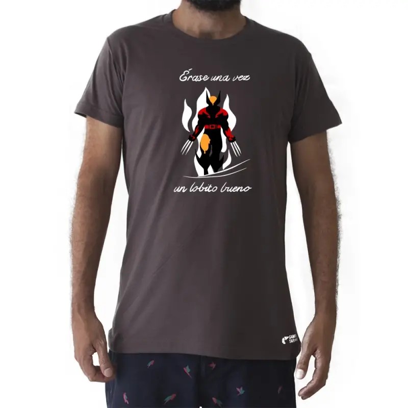 Una mezcla de conceptos que nos propone Luis Rivera Linares con el mítico personaje: LOGAN (lobezno), WOLVERINE de MARVEL y la canción popular lobito bueno. Camiseta producida por la GAMBA TARONJA.