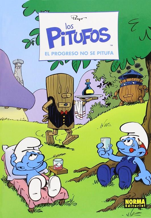 Libro de historietas encuadernado en cartoné de 48 páginas interiores en color más cubiertas que contiene la traducción del original Les Schtroumpfs 21. On ne schtroumpfe pas le progrès publicado por Le Lombard en 2000 para el mercado francobelga.