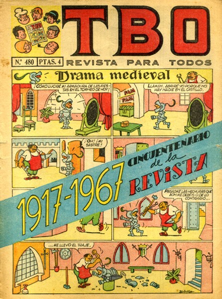 Revista de historietas grapada de 16 páginas interiores en blanco y negro y en color más cubiertas en color que contiene una selección de historietas de autores españoles. Serie de 789 volúmenes y 69 números extraordinarios iniciada en 1952, que retoma la