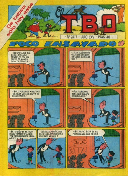 Revista de historietas grapada de 16 páginas interiores en blanco y negro y en color más cubiertas en color que contiene una selección de historietas de autores españoles. Serie de 503 volúmenes, 137 números extraordinarios y 14 números especiales iniciad